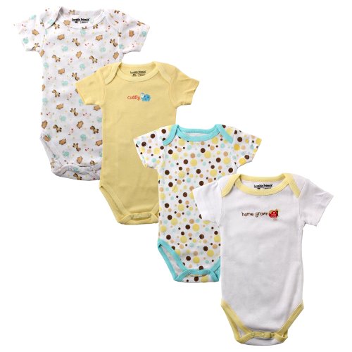 Luvable Friends premium layette collection of cute baby clothes and baby care products feature 100% lightweight cotton for the softest touch on your baby's gentle skin. Bodysuits are essential to any baby's wardrobe, and these bodysuits are so comfortable that they can be used as underwear or even on their own. The one-piece design makes for no fuss dressing, and snap closure at the crotch make diaper changing easier. Assorted printed designs in 3 colors.