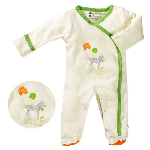 NEW!! This adorable Baby Soy kimono footie looks good enough to eat with its cheery candy colored trims and colored feet. Neutral color body means less dye and provides the right background for nature artist Tara Hogan's brilliant animal illustrations. This new Baby Soy footie is a celebration of nature and its inhabitants. When purchasing any babysoy items, you know you are helping to reduce, reuse and now organically helping planet earth! Sizes 0-3M and 3-6M come with palm wrapper that prevent