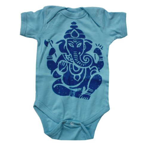Ganesha, also spelled Ganesa or Ganesh and also known as Ganapati, Vinayaka, and Pillaiyar, is one of the best-known and most worshipped deities in the Hindu pantheon. His image is found throughout India. Devotion to Ganesha is widely diffused and extends to Jains, Buddhists, and beyond India. Although he is known by many other attributes, Ganesha's elephant head makes him easy to identify. This is a super soft, 100% cotton, baby bodysuit screen printed in royal blue ink. We have the following