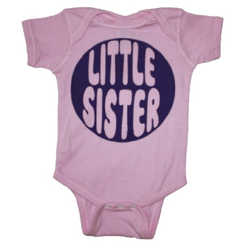 Little Sisters are great; and this bodysuit will let everyone know who the little sister is! This 100% cotton baby bodysuit is light pink and is screen printed by hand in purple ink. This piece is part of our line of original apparel available at our Happy Family Clothing shop. We have the following size bodysuits available: