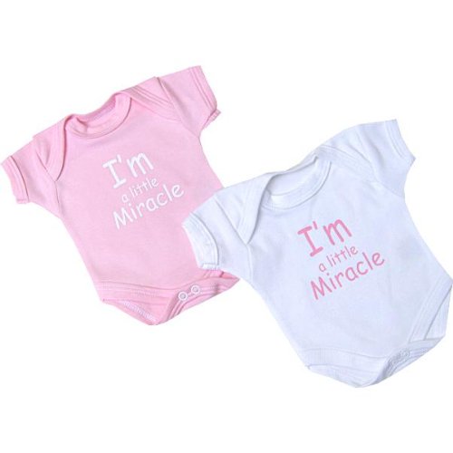 This is a pack of 2 envelope neck bodysuits with popper fasteners at the bottom to make dressing your baby easier. 1 White & 1 Pink or Blue, both with a motif reading 'I,m a little miracle'. They are quality garments made from 100% Cotton, machine washable at 40 degrees and manufactured in our own factory in the UK. Free UK delivery. All orders received before 12pm Mon to Fri are despatched the same day (except Bank Holidays). Available in sizes Prem 1 (1.5-3.5lb),Prem 2 (3.5-5.5lb) & Prem 3 (5.